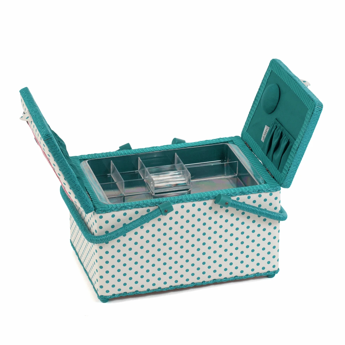Large, rectangular, twin-lidded sewing box covered with 100% cotton fabric with appliqué Cat design. With hand stitched felt embellishments and embroidery. PVC double handles. Hard plastic internal tray with compartments for sewing accessories. Internal pocket and pincushion inside lid. Spot clean only.