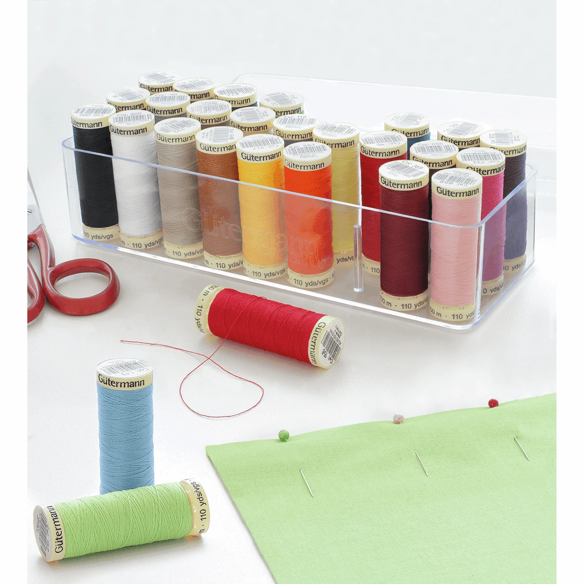27 100m reels of Gutermann Sew-all thread in a transparent storage box. Includes the most popular shades. Sew-all thread suits all fabrics and can be used for both hand and machine stitching. Manufactured used Micro Core Technology®. MCT® is a unique microfilament polyester-based core spun technology, making threads uniform, line-free and fin. The transparent plastic boxes are practical for storing, sorting and even transporting your threads.