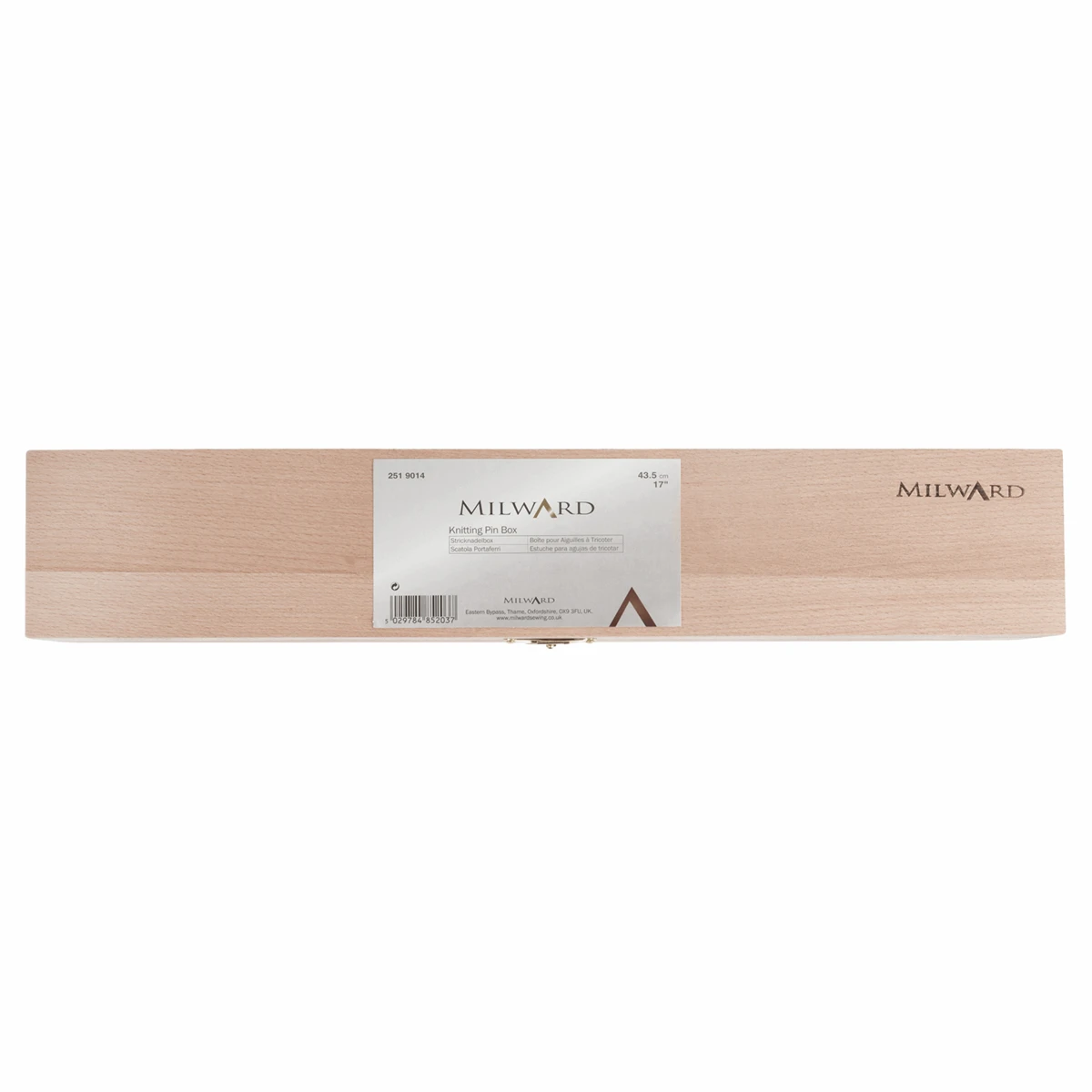 Suitable for knitting pins up to 40cm in length. Front clasp to secure lid from opening. Made from beech hardwood for strength and durability. Laser etched Milward logo.
