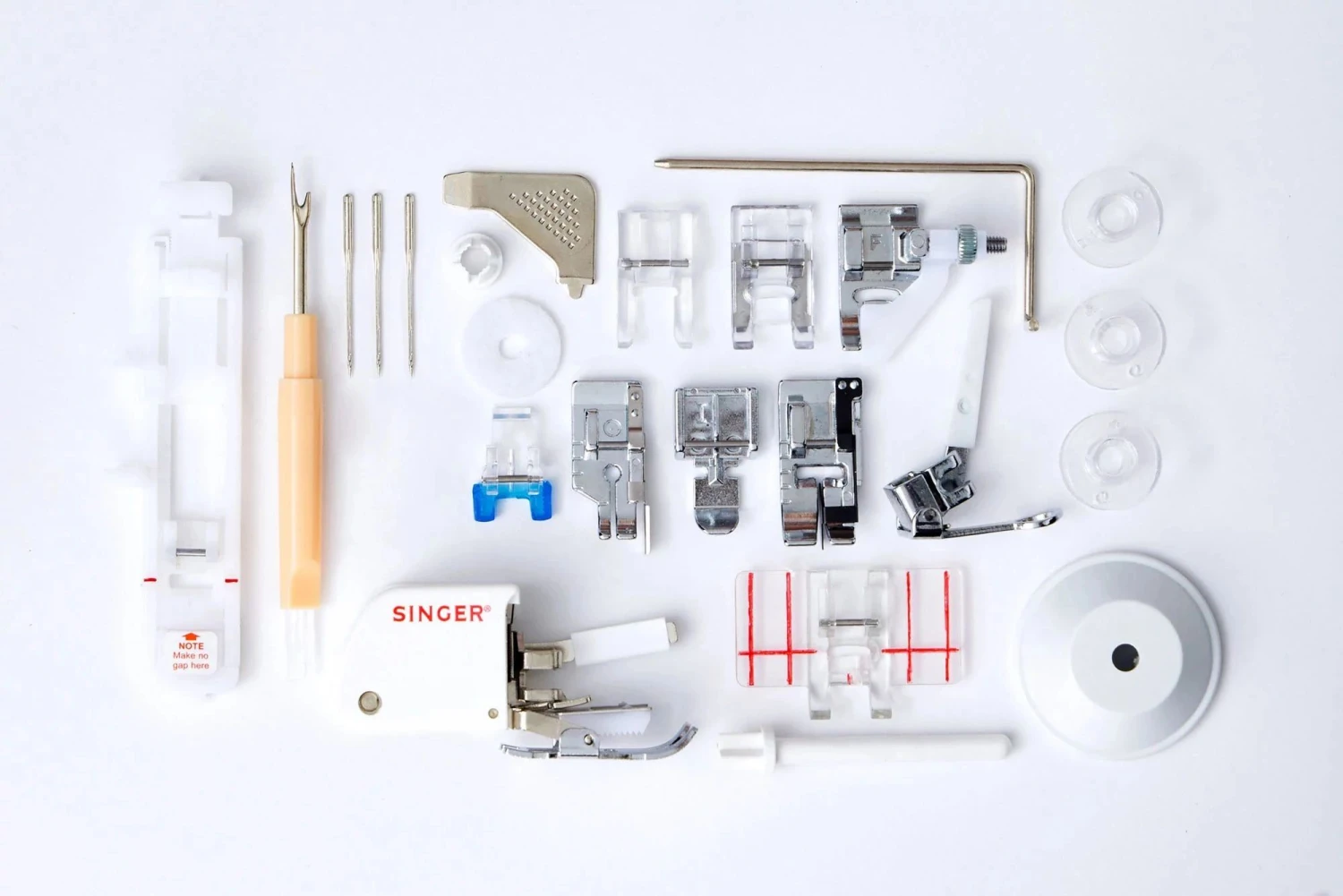 All Purpose Foot, Zipper Foot, Buttonhole Foot, Button Sewing Foot, Blind Hem Foot, Satin Stitch Foot, Even Feed/Walking Foot, Open Toe Foot, ¼” Foot , Darning/Embroidery Foot, Edge Joining Foot, Multi-Line/Parallel Sewing Foot, Class 15 Transparent Bobbins, Spool Pin Felt, Large Spool Cap, Small Spool Cap, Auxiliary Spool Pin, Seam Ripper/Lint Brush, L-Screwdriver, Edge/Quilting Guide, Extension Table